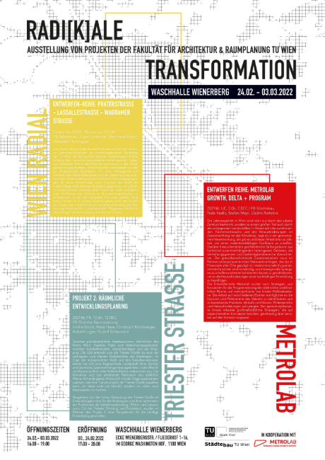 Nach einer gemeinsamen Exkursion und einer intensiven Auseinandersetzung mit dem Gebiet haben die Studierenden insgesamt 7 Konzepte entwickelt, die auf den nachfolgenden Seiten genauer beleuchtet werden. Zum Abschluss folgte gemeinsam mit dem Forschungsbereich Städtebau der TU Wien die Ausstellung RADI[K]ALE TRANSFORMATION in der Waschhalle Wienerberg.